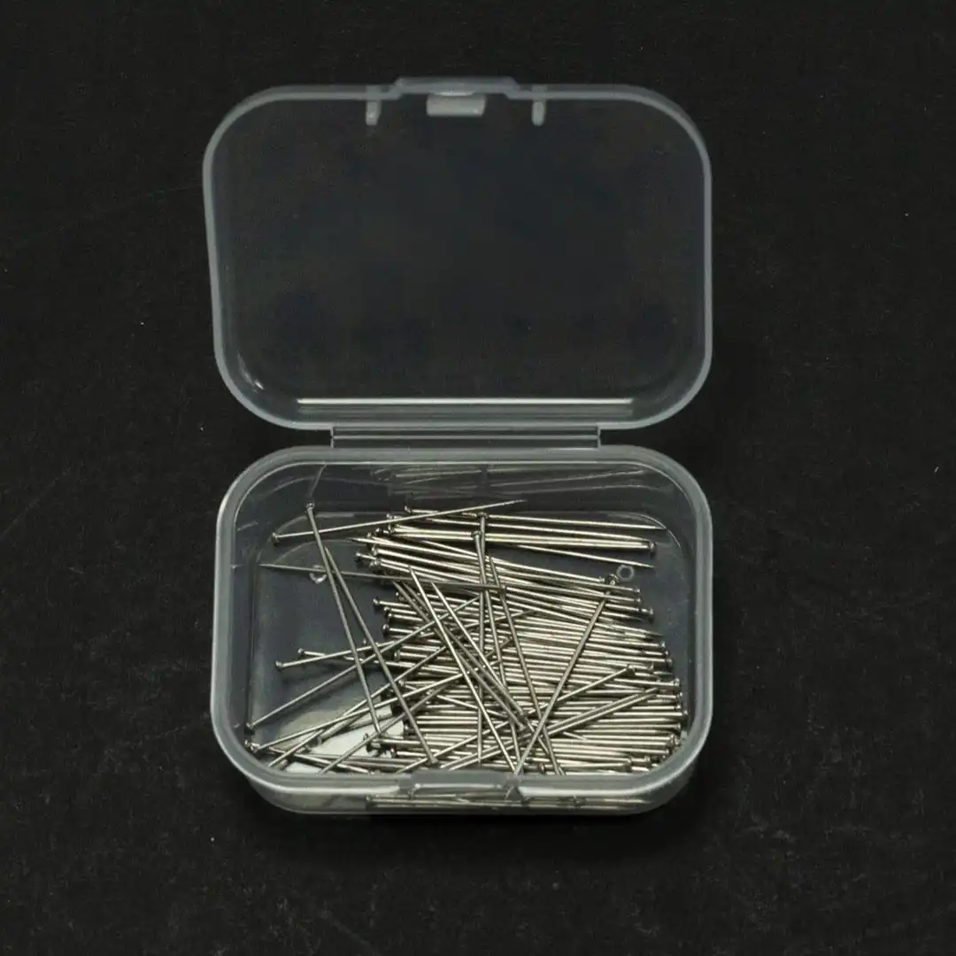 Headless clear stainless steel scarf pins. Box of 100 scarf headless pins. Each pin measures 26mm, 28mm, 30mm, 33mm, 35mm perfect for securing scarves or fabrics stylishly.